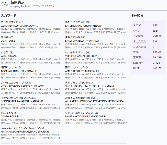 簡単に振り返ると、ぱっと見6,8,15ワード目がかなり失敗してるように見えます