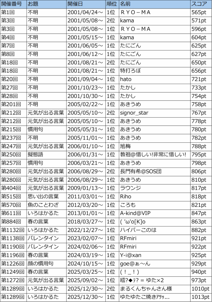 ※942回の「加藤純一」名義の人と、993回の「まこなりナリ」名義の人は辞典上消されてたので消しました